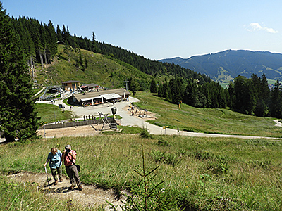 Vom Kolbensattel (links) führte eine Wanderung durch den Wald auf die Stufe der Almen (unten). Das August-Schuster-Haus am Pürschling liegt auf 1564m ü. NN.