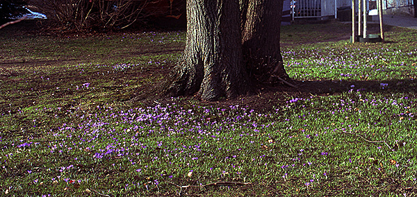 In Aachen und Umgebung macht sich eine weitere Art breit, der Dalmatiner Krokus (C. tommasinianus), auch Elfen- oder Bauern-Krokus genannt. Wie der deutsche Name schon nahelegt, stammt die Art aus Südosteuropa von Ungarn bis Bulgarien. Sie blüht selbst für Krokusse sehr früh, schon ab Februar. Im lichten Schatten größerer Bäume bildet sie große Rasen aus. Die gleichmäßige Verteilung der Pflanzen lässt vermuten, dass sie nicht nur aus Tochterknollen sondern auch leicht aus Samen verwildern. Zuerst ist mir das auf dem Friedhof Aachen-Lintert aufgefallen. Inzwischen habe ich die Art auf etlichen weiteren Friedhöfen und Parkanlagen gefunden. Das Foto unten stammt von einem kleinen Zwickel an der Krefelder Straße in Aachen nahe der Bastei.